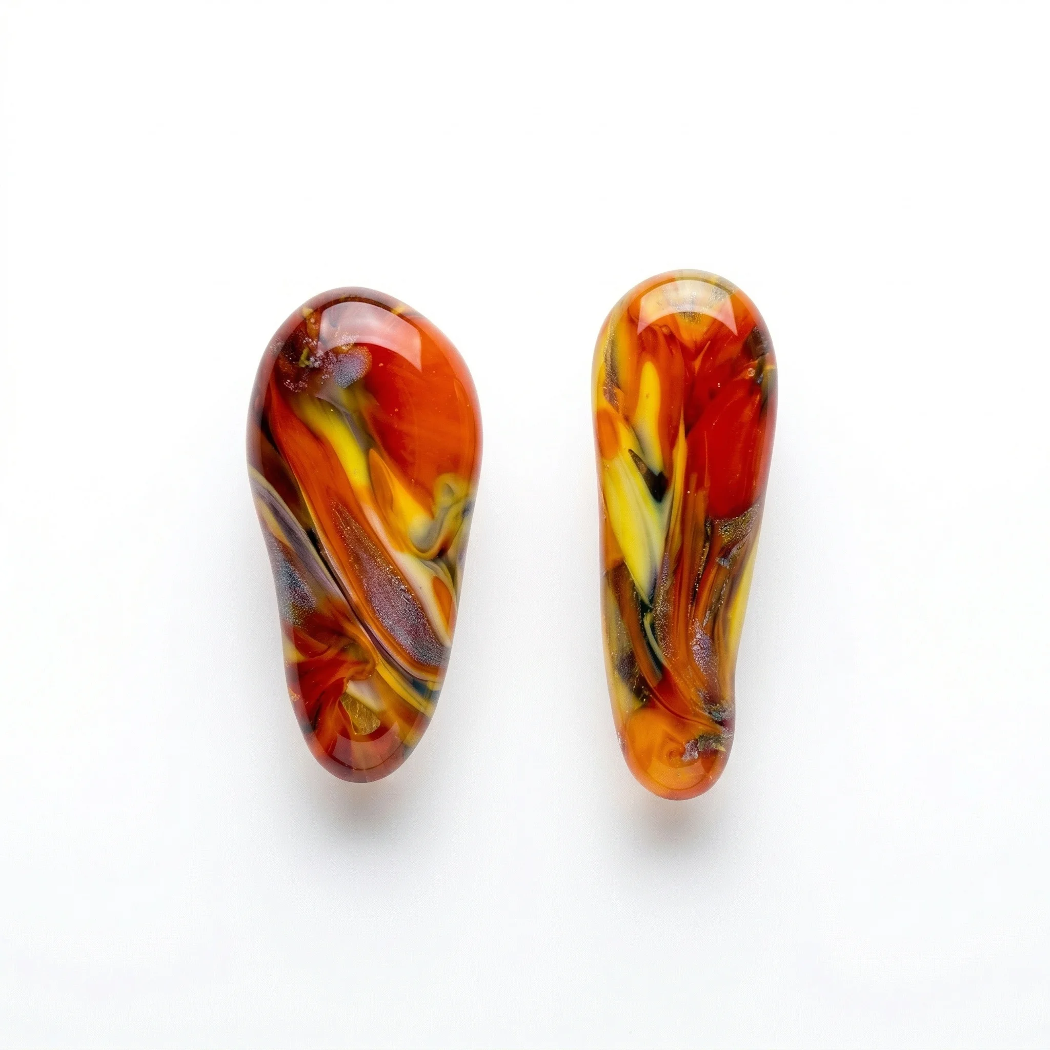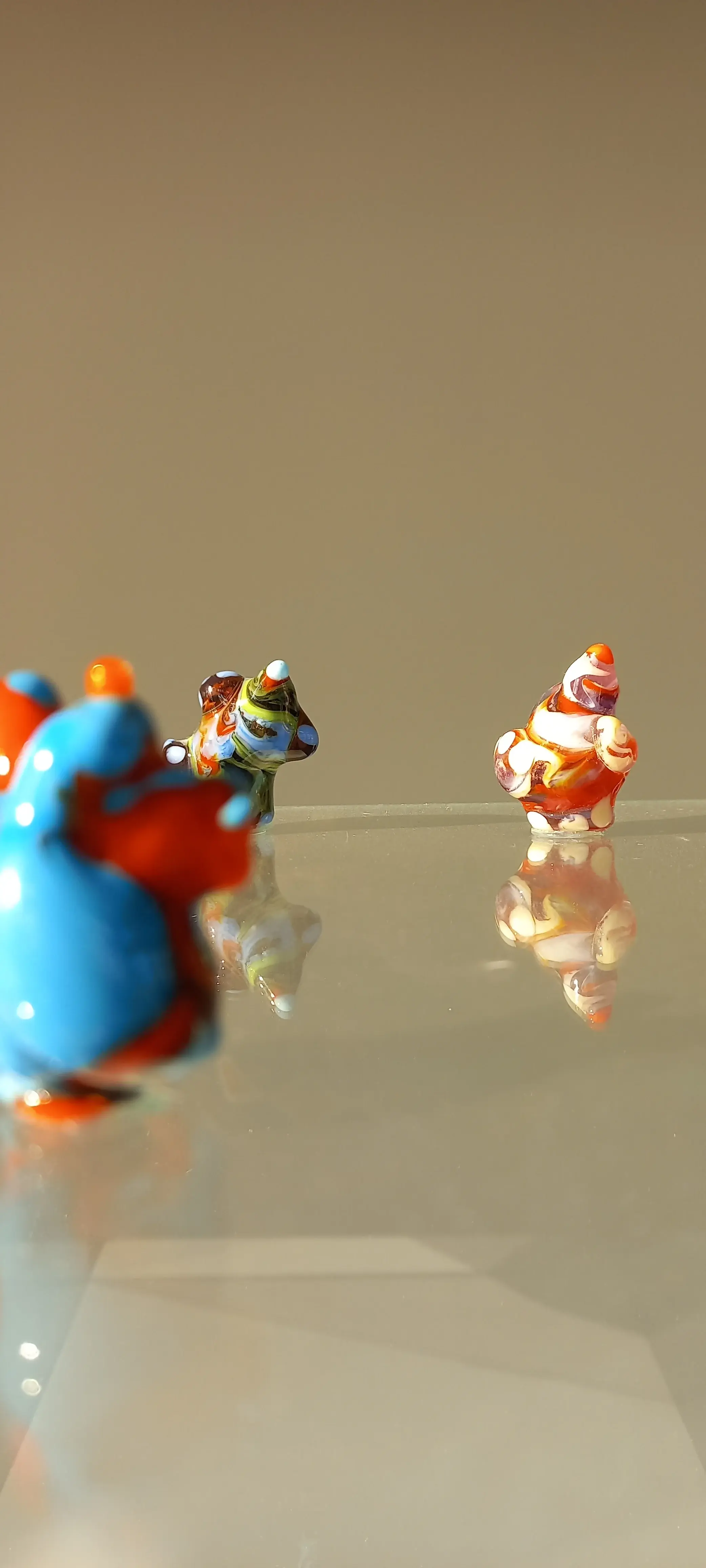 Svaki komad ručno je izrađen od Murano stakla. Forme su organske i geometrijski amorfne. Zbog prirode materijala i procesa izrade, svaki komad razvija sopstvene nijanse, linije i unutrašnje strukture — male pejzaže energije zarobljene u materijalu.
