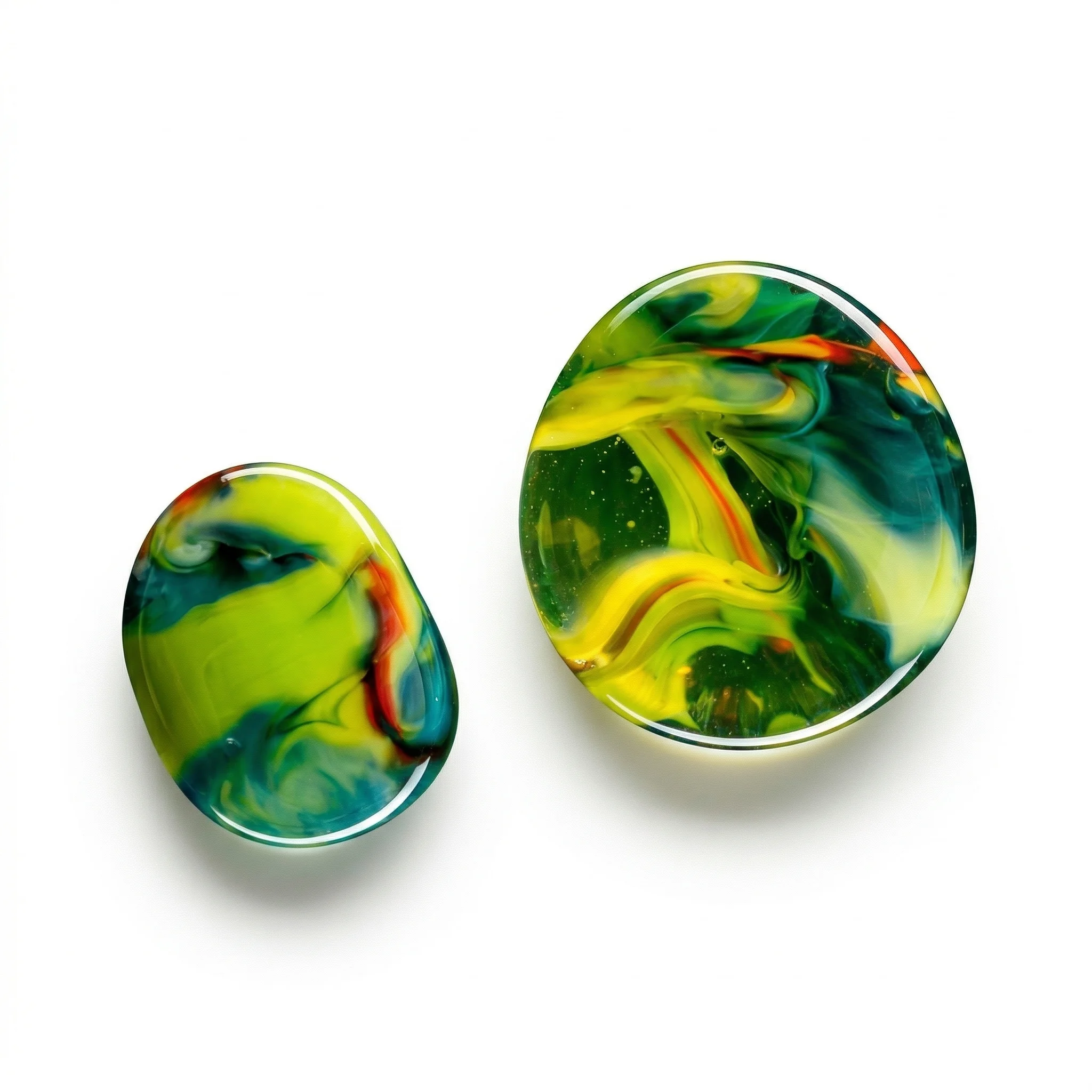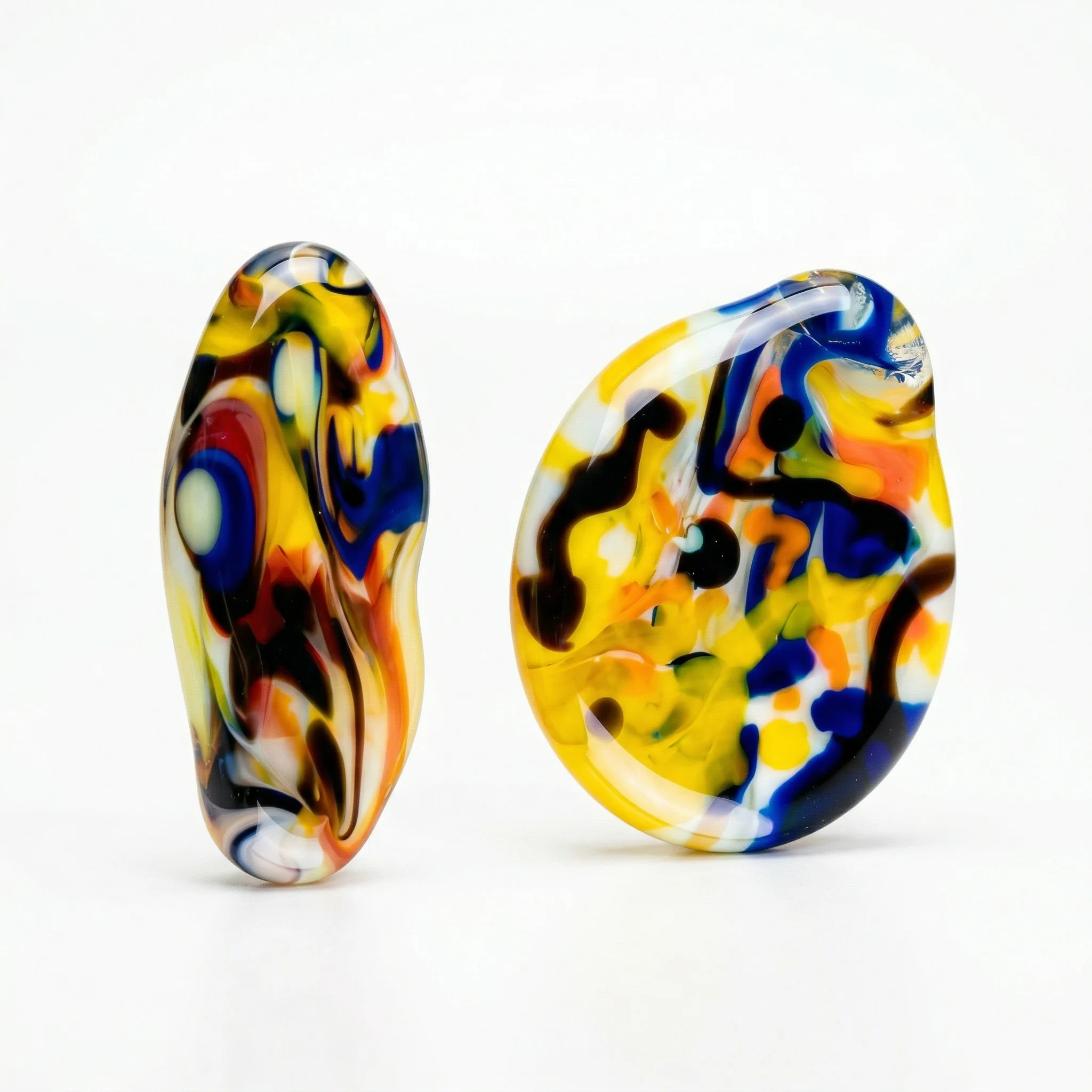 Svaki komad ručno je izrađen od Murano stakla. Forme su organske i geometrijski amorfne. Zbog prirode materijala i procesa izrade, svaki komad razvija sopstvene nijanse, linije i unutrašnje strukture — male pejzaže energije zarobljene u materijalu.